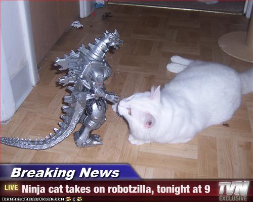 Breaking News Ninja Cat Takes On Robotzilla Tonight At 9 Cheezburger Funny Memes Funny Pictures
