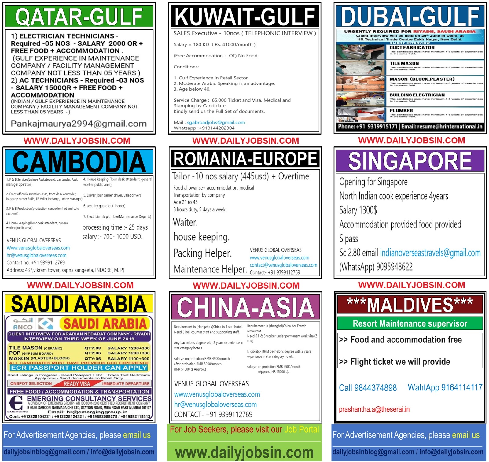 Jobs In Singapore Romania Europe Cambodia China Maldives Gulf Countries Walk In Interview In India From 15 To 20 June 2019 Dailyjobsin Daily Jobs In