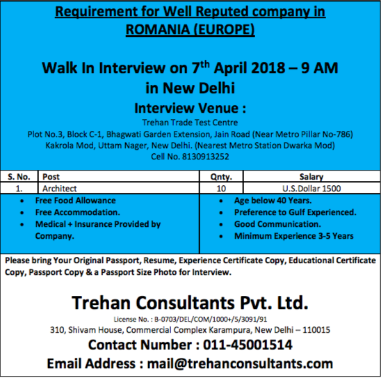 Architects Required For Well Reputed Company In Romania Europe Gulf Jobs Work Abroad