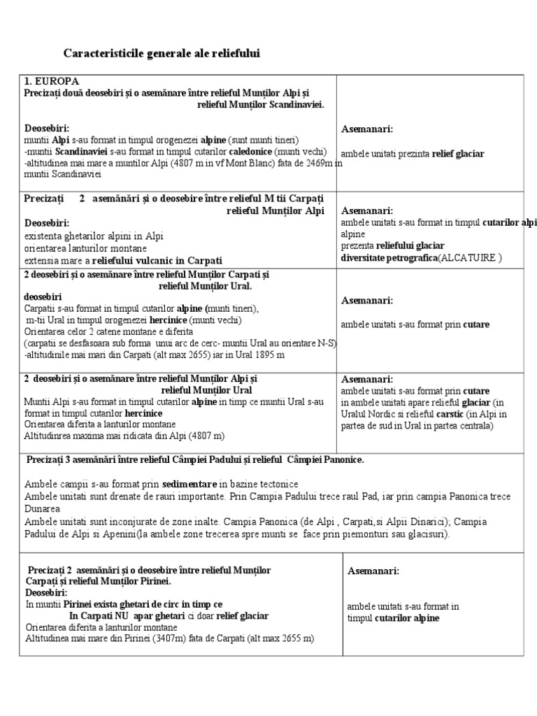 Tabele Asem Deosebiri Relief Europa Romania