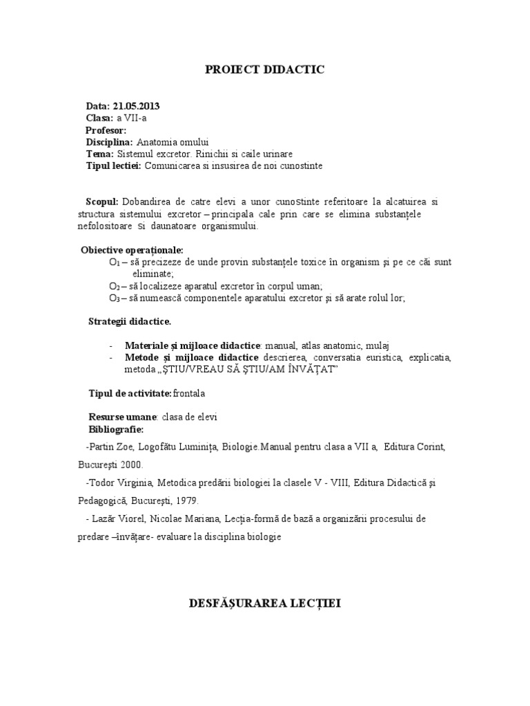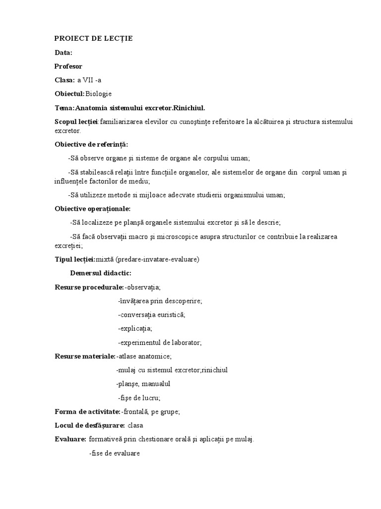 Proiect De Lectie Clasa A Vii A Anatomia Si Fiziologia Omului Anatomia Sistemului Excretor Referat